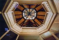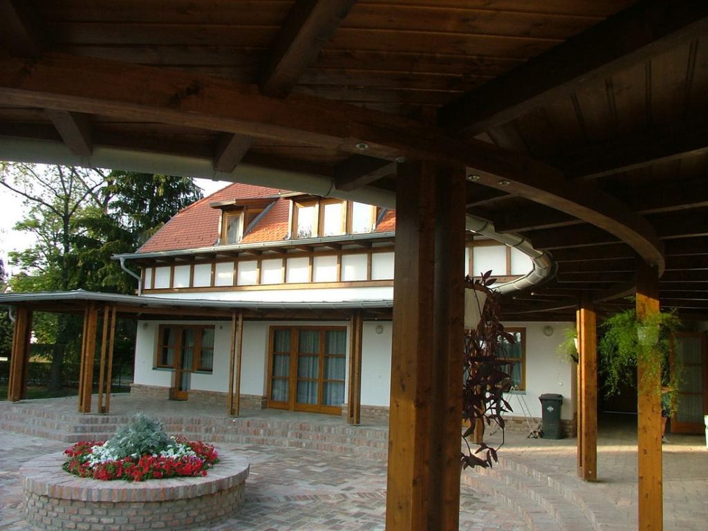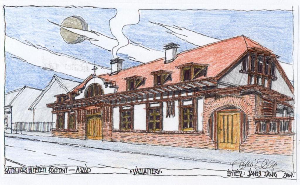 Mindennek megfelelően, a hagyományos, zártsorú utca, századfordulós épületeinek konkrét osztásvilágát (lábazat, ablak, osztópárkány, eresz alatti díszítés) figyelembe véve alakítottuk ki az épületet úgy, hogy a régi épületnek megfelelő vakolatosztásokat és keretezéseket fából csináltuk meg, a tetőtér beépítéssel pedig a templom főbejárata feletti motívumát idéztük. A belső udvar szintén a történeti világot idézi (?L? alakú beépítés, fatornácos folyosó), de az íves megformálás a mai világba helyezi azt úgy, hogy egyben a közösség érzését is erősíti a kerek udvarral, mely érzésnek az irányultsága egyértelműen a templom szellemisége fele nyitott.