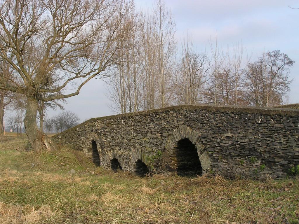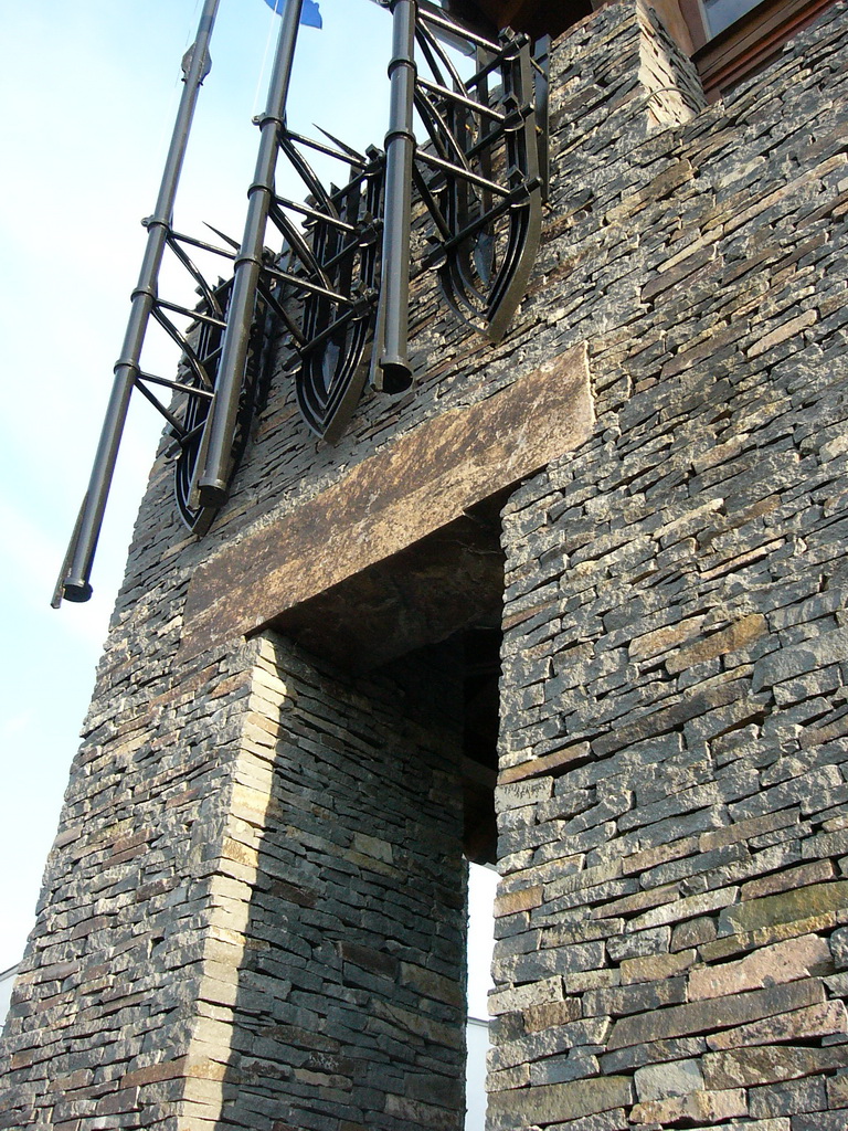 A kőburkolat egész közelről származik, ilyenből épült a gótikus Szent Gotthárd kőhíd a falu határában. A terveken a kőfalba egy nyers kő áthidalót rajzoltunk, két méter hosszú, hatvanszor hatvanas hasáb. Elkezdtek egyet faragni, de már látszott hogy reménytelen a vállalkozás, amikor a bányából szóltak, hogy a robbantáskor pont egy ilyen darab esett ki, jöhetnek érte?