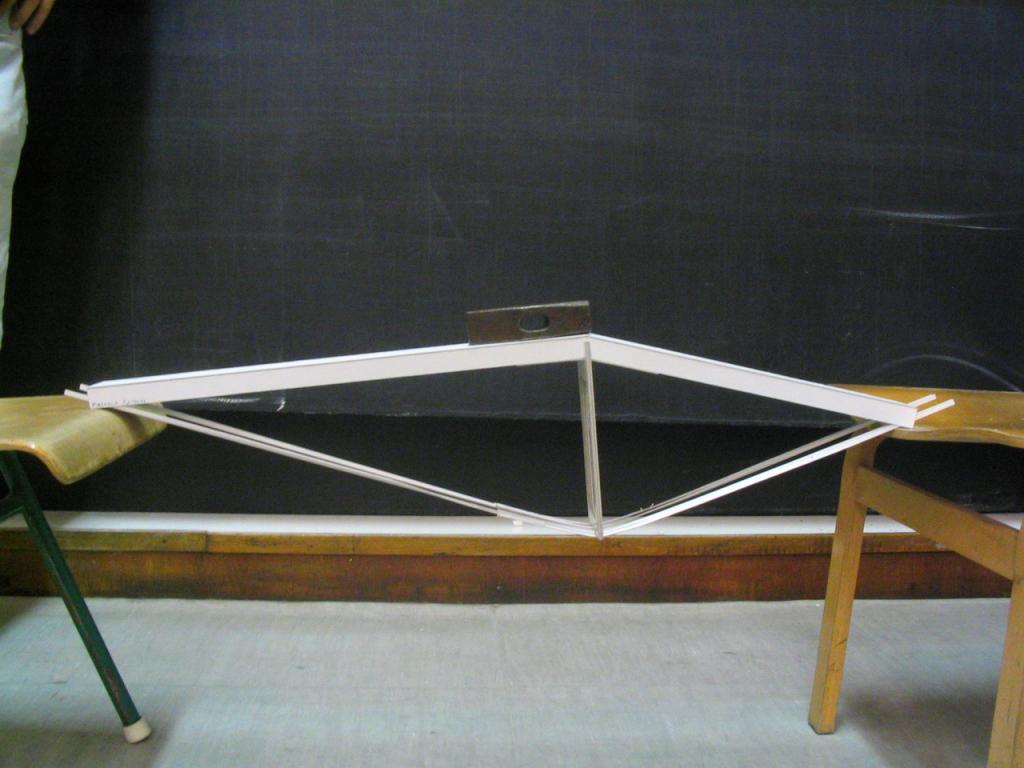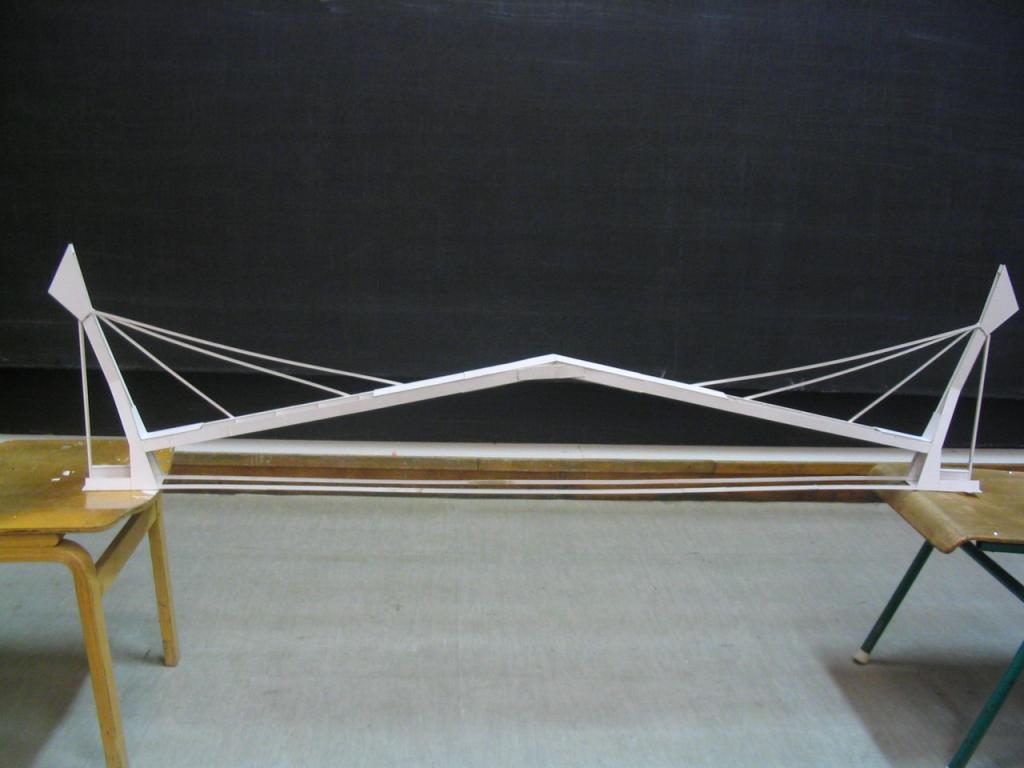 Az adott méretű, 50x70 cm-es triplex kartonból olyan szerkezetet kell készíteni, mely min. 80 cm szabad fesztávot hidal át, közepén 80 dkg. súllyal. A feladathoz a papír ragasztó használható, más segédszerkezet nem alkalmazható. Az áthidaló szerkezetnek stabilnak kell lennie, megtámasztása, merevítése nem megengedett.